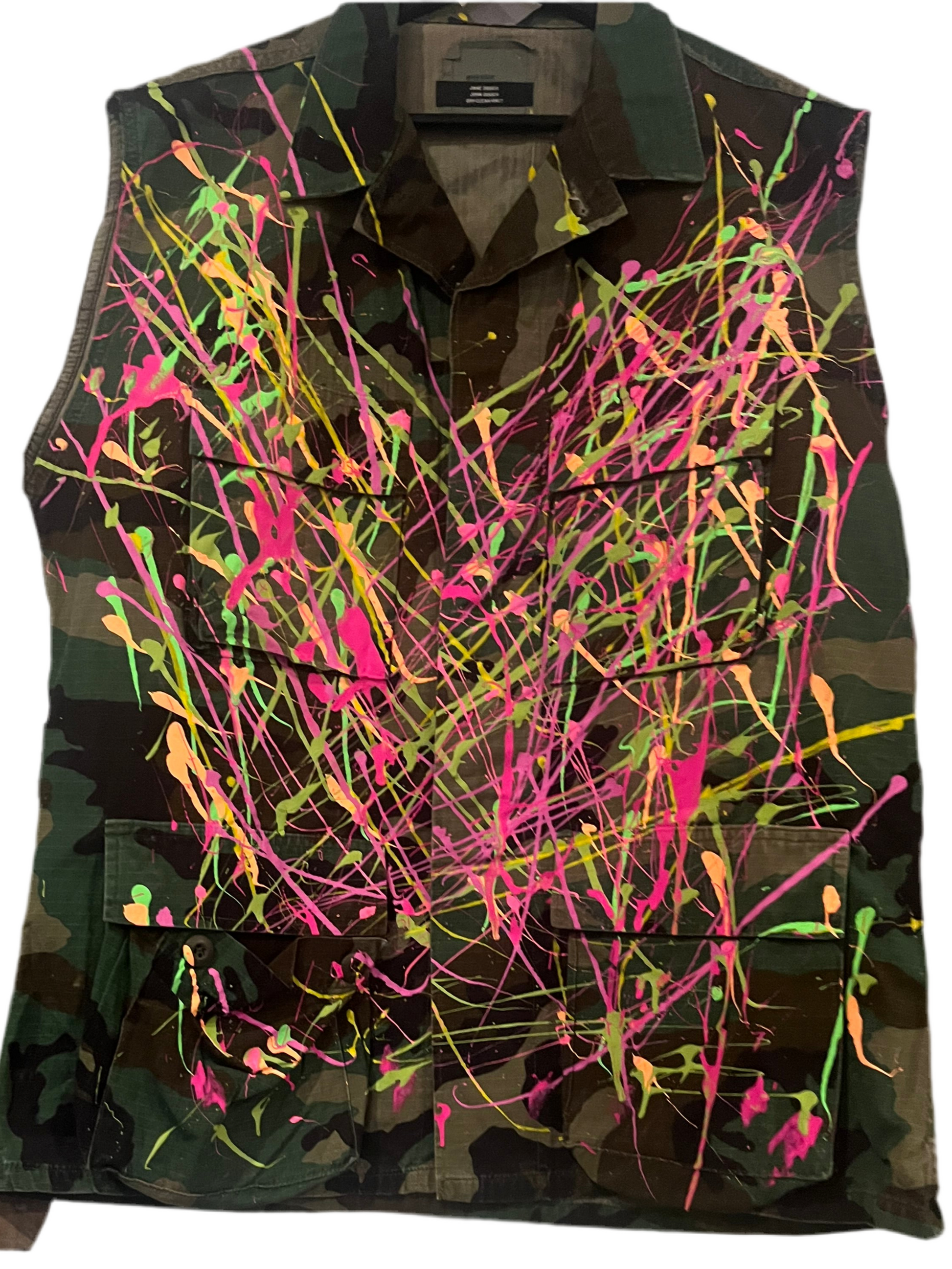 Upcycled Camo Vintage Vest. Recreated with chenille applique and paint.
