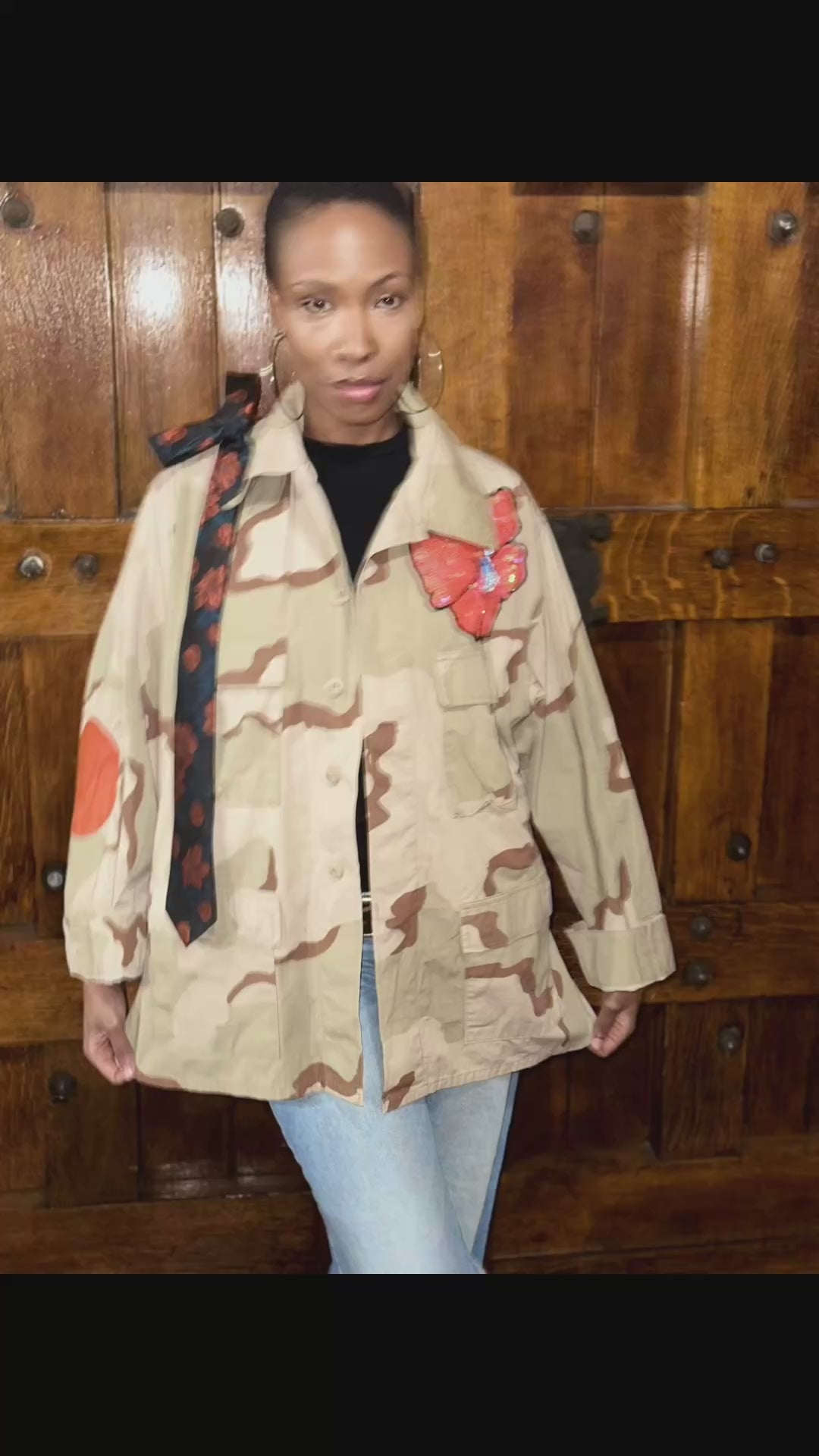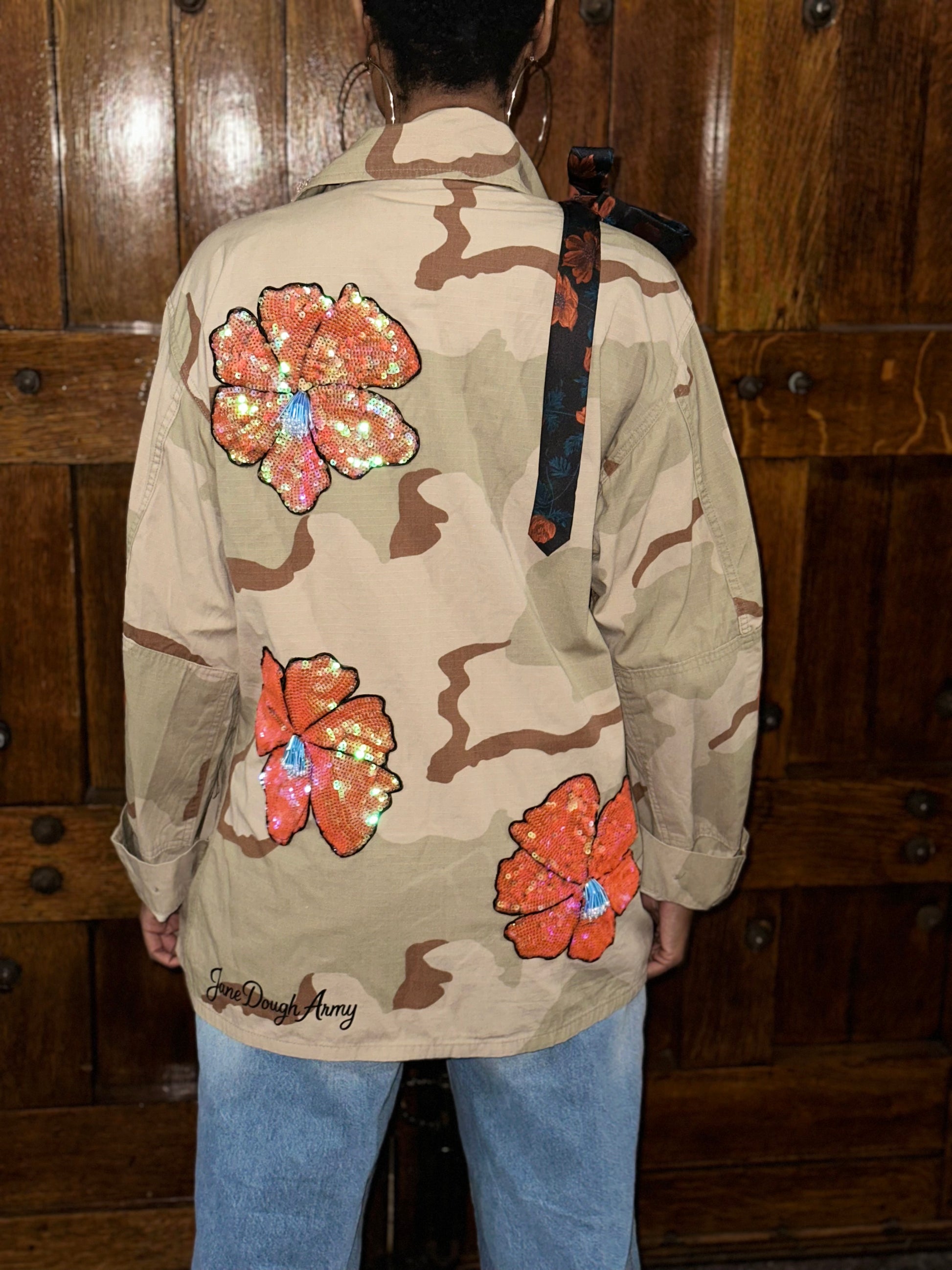 Upcycled CAMO BDU Jacket with orange sequin flowers and floral neck tie details size Large one of a kind