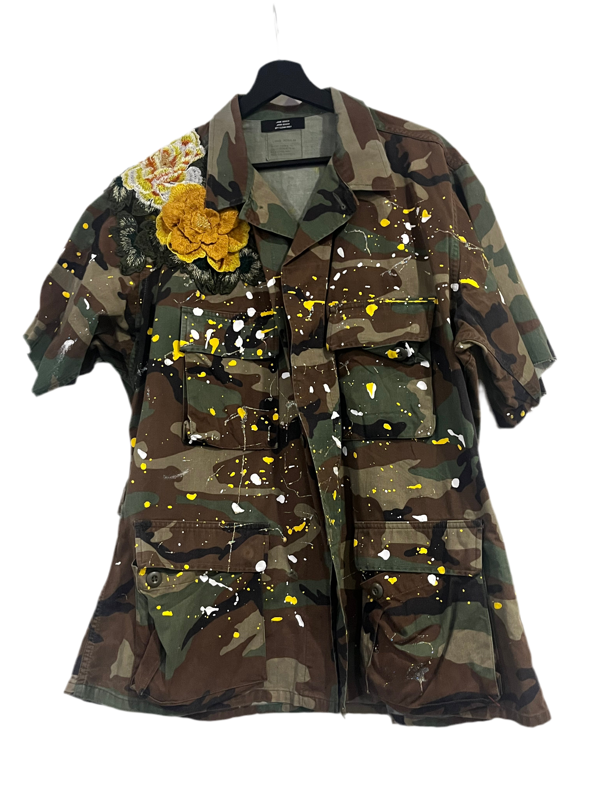 Upcycled Camo Vintage Short Sleeve Jacket. Recreated with floral applique and paint.